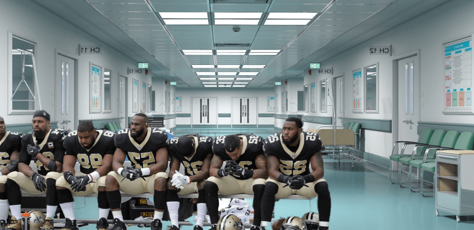 “It’s like a warzone,” said Sarah Young, a nurse at Tulane Medical Center, as she removed a running back’s elbow sleeve to start an IV. “I haven’t heard about this many wounded saints since my catechism.”
